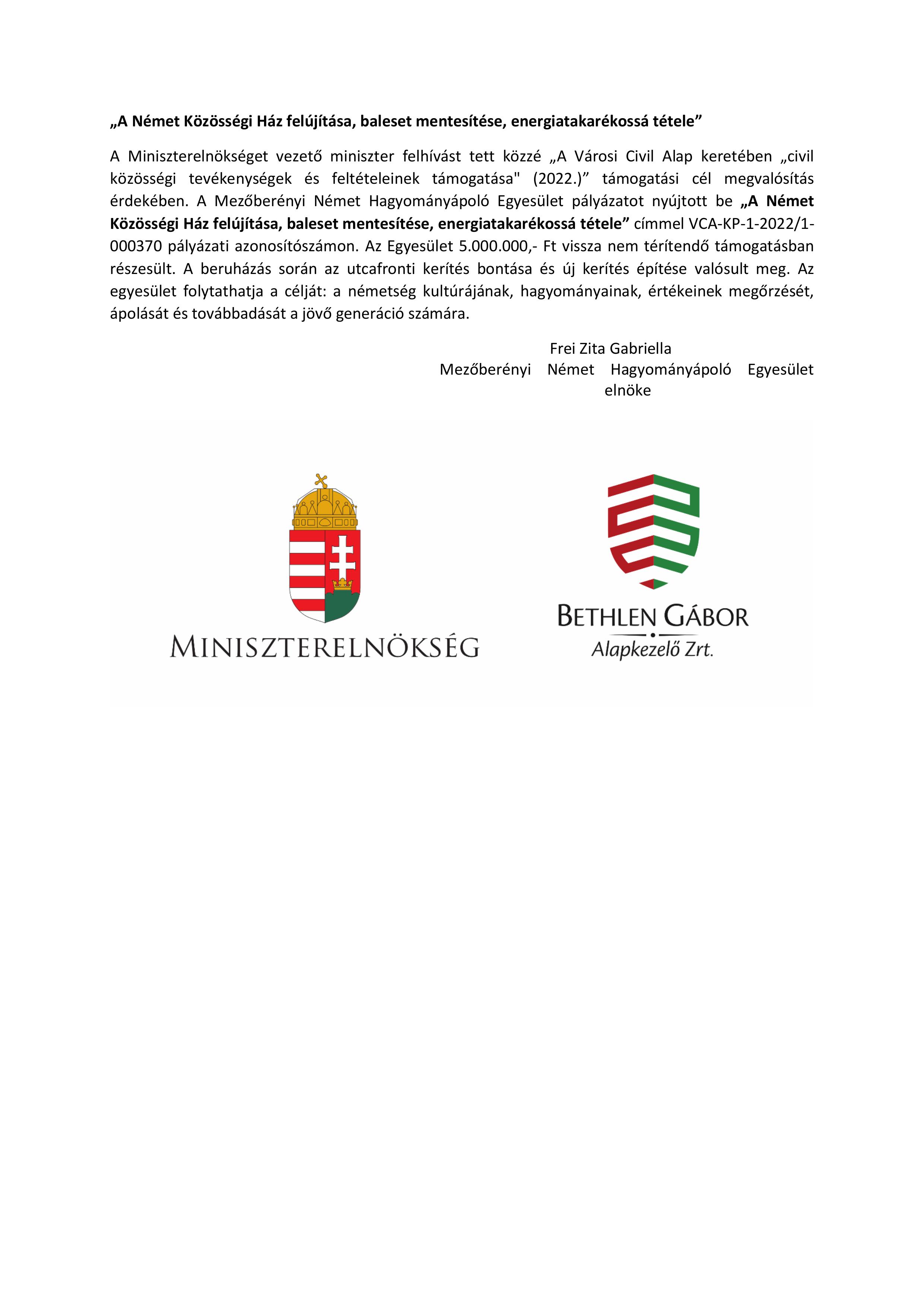 Kedvezményezett: Mezőberényi Német Hagyományápoló Egyesület